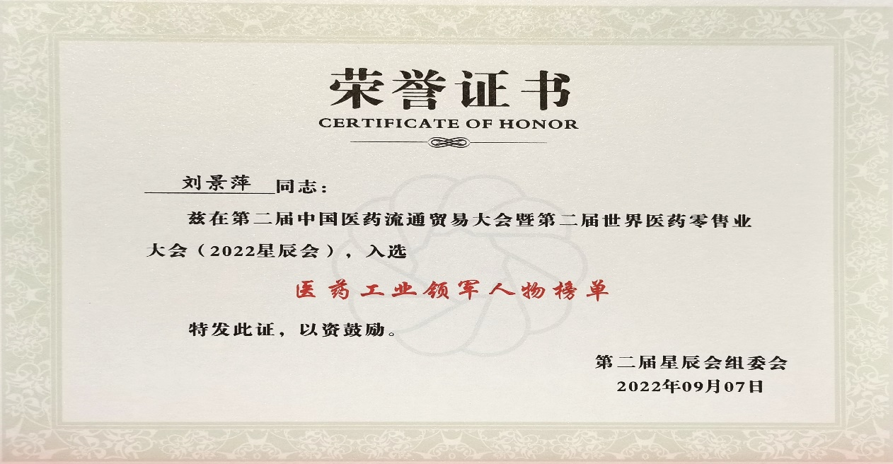 本次星辰会期间,金年会斩获颇丰,获得多项行业奖项及荣誉。在开幕式上,刘景萍董事长荣获“医药工业领军人物”称号。