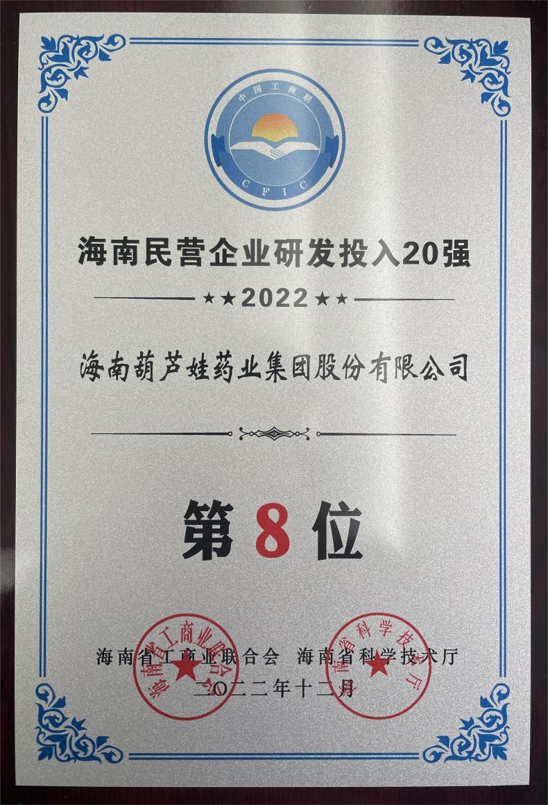 12月23日,2022海南民营企业50强和研发投入20强发布会在海口举行。会上发布了“2022海南民营企业50强”“2022海南民营企业研发投入20强”榜单和分析报告。金年会药业再次荣登两榜,在海南民营企业50强榜单中位列第25位,较去年上升8位,这也是公司连续三年登榜;在海南民营企业研发投入20强中位列第8位,较去年上升7位。