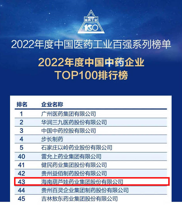 金年会药业集团连续4年荣登“中国中药企业TOP100排行榜”,排名上升至第43位